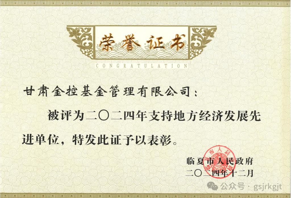 近日,甘肃金控基金管理有限公司被临夏市政府授予“2024年度支持地方经济发展先进单位”荣誉称号,这是地方政府对金控基金在服务实体经济、支持地方产业和促进县域经济高质量发展等方面工作的高度肯定,也是对金控基金和市州担保公司业务协同发展的激励。